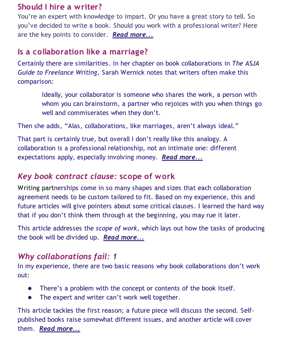 Do you want to write and publish—or self publish—a book? Here’s lots of advice. The articles below distill Stephanie’s years of experience as a professional book writer, editor and collaborator on nonfiction books.